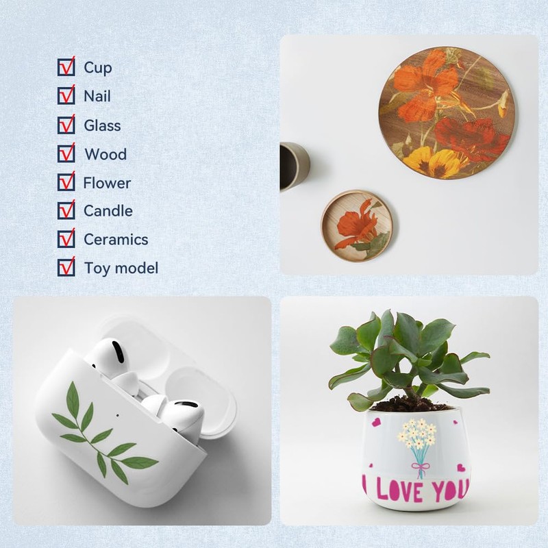 • Personalized printing: Create unique and personal gifts for friends. Use our water decal paper transfer for tumblers, glass, ceramics, wood, and even nail-art.