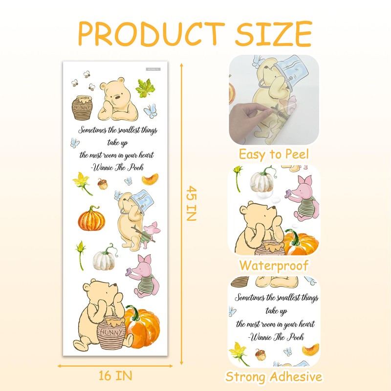 - Large Size: Featuring a variety of beloved Winnie characters and scenes, The entire set measures 16 x 45 inches with different sizes and patterns designs, these wall stickers allow you to create your own unique layout, satisfying your unlimited creativity, presenting a cartoon theme quickly and easily in minutes!