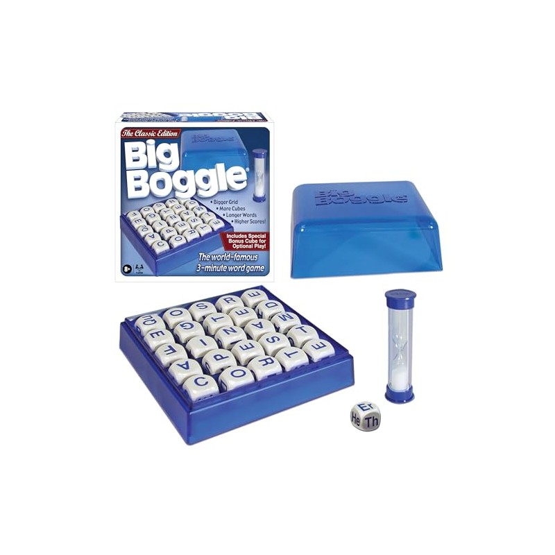 Boggle, the world-famous 3-minute word game is now available as "Big Boggle. The new "Double Letter" cube makes it easier to form longer words. This game contains a bigger grid, more cubes and allows for higher scores. For 2 or more players.