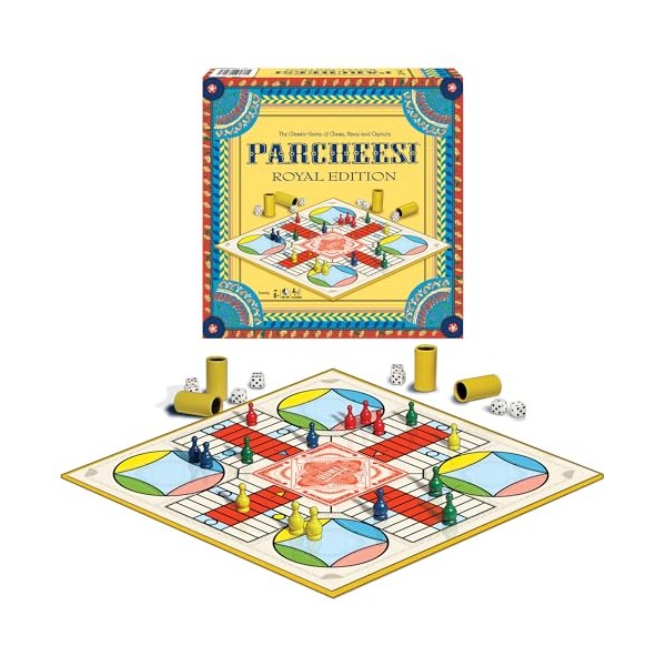 Remember that classic, colorful game of Parchessi® from years past? Well now it's back - and with the dice cups. The Royal Edition features the original game board and packaging of Parcheesi® - the cherished look and feel that will surely bring back fond memories. In Parcheesi® Royal Edition, players race to get all of their pawns into the center "home" space. Watch out for blockades and captures or be sent back to the starting point. The Royal Edition brings back the cherished look and feel that players know and love.