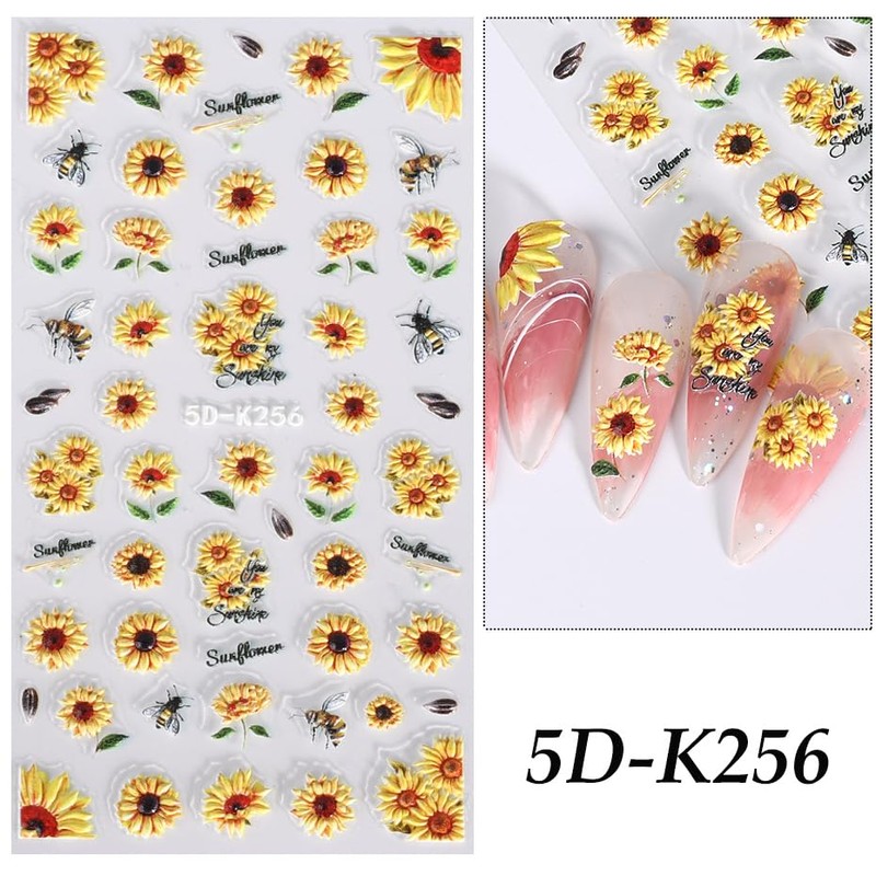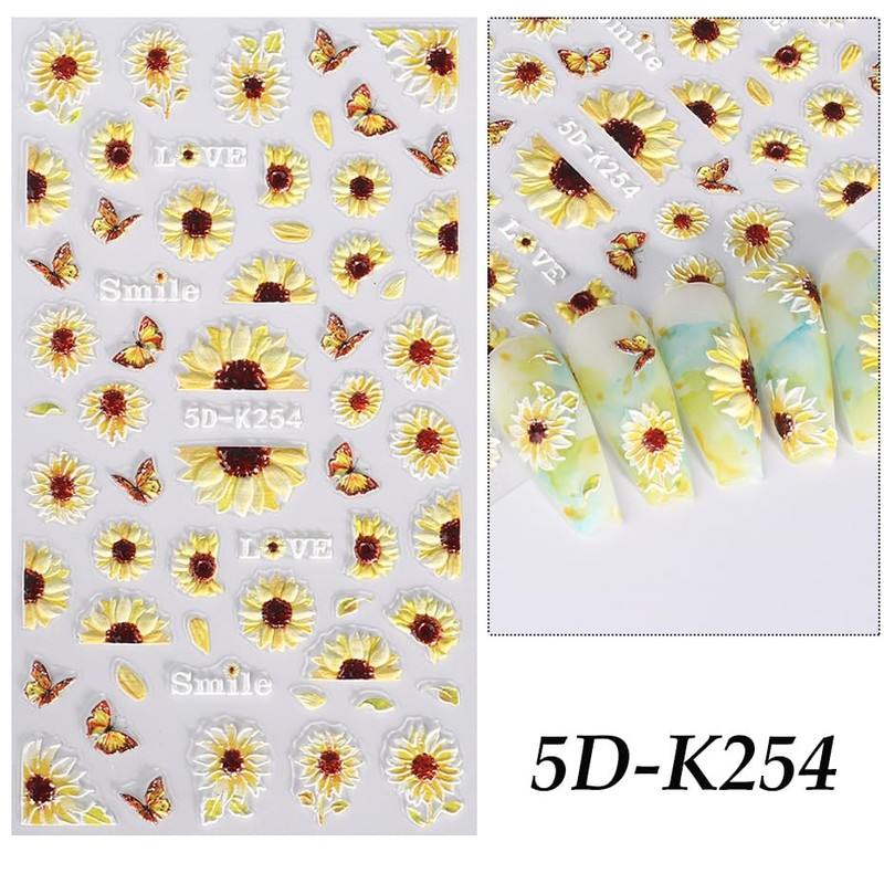 Winning Smile 6 Sheets Nail Art Decals 5D Embossed Stickers|Professional Texture Fashionable Embossed Three-Dimensional Adhesive Decals|Nail Decoration Stickers- Summer kaleidoscope (Yellow Sunflower)