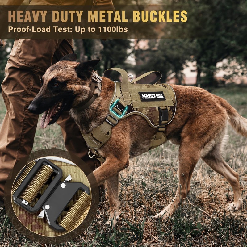 - 【2x Metal Shoulder Buckles】: Two Metal Shoulder Buckles can bear great pulling force, ensuring your dog is safely harnessed during training, hunting, working, and any other occasion. 2x quick-release Plastic Buckle( 250lb proof-loading) on chest position. This dog harness is made with military grade materials and reinforced stitching. Well padded in every pressure load point to protect your dog, while the breathable air mesh keeps your dog ventilated and comfortable