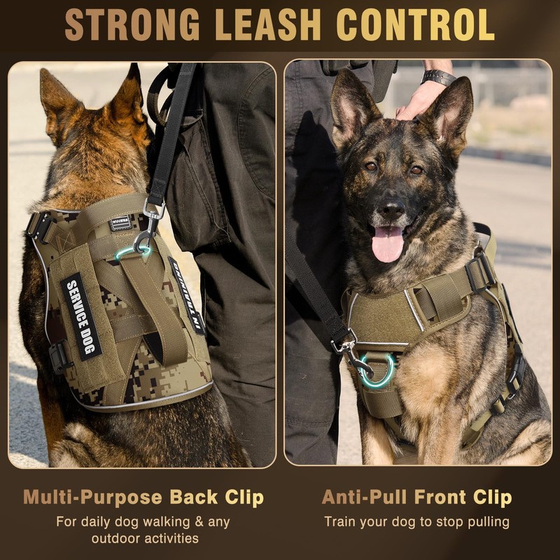 - 【2x D Rings for Leash Clip】: This military service dog vest features 2 stainless steel D-rings gives the handler/owner various leash attachment options - One Anti-Pull Front Clip to control dogs on walks without choking or harming them; One heavy duty D-Ring near dog's neck for casual walking with short leash. The double handles are great for you to assist your dog in any position, it is much safer than pulling at a collar that is around the neck.