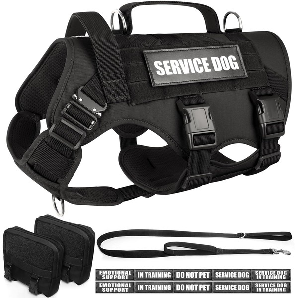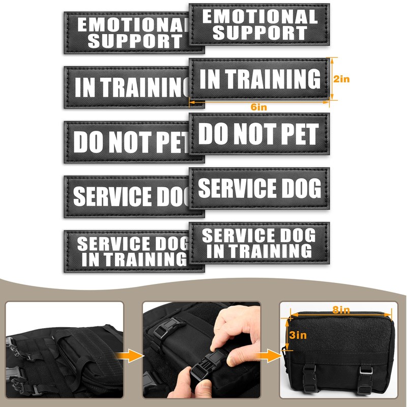 - 【Molle System】: Equipped on both sides for pouches, water bottles, and tactical dog gear. Multiple Hook & Loop Panels for morale patches and badges to showcase your dog’s personality. A wide range of use for personal service, law enforcement, hunting, or outdoor recreation. The package contains a dog harness, and 10 pieces of dog patches, such as Service dog, do not pet, in training, emotional support and service dog in training, enough quantity for you to decorate the dog’s vest harness.
