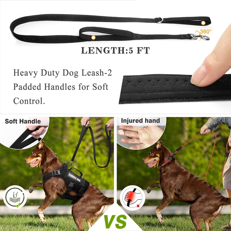 - 【Padded Sturdy Handle for Harness and Leash】: The double handles for harness are great for you to assist your dog in any position, it is much safer than pulling at a collar that is around the neck. A full tactical dog harness leash set including: 1 military dog vest harness + 2 backpack pouches + 1 training dog leash with 2 padded handles + 10 patches reflective.