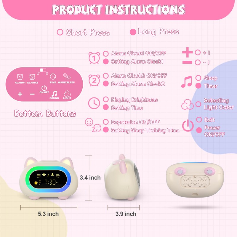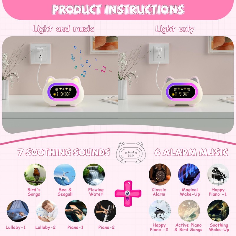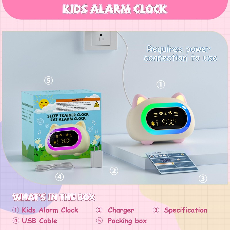 • 10 Colorful Night Light Alarm Clock for Kids: Introduce a touch of enchantment to your child's bedroom with our alarm clock featuring a mesmerizing night light. Transform their space into a mystical realm with ten different light modes. Watch as the adorable cat casts spells of comfort and adventure, making bedtime a magical experience.
