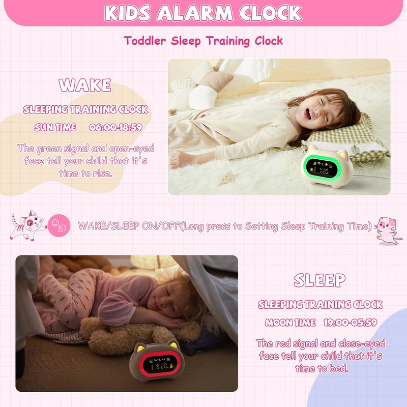 • Kids Alarm Clock with Sleep Training: Develop healthy morning routines and sleep habits with our visually-aided alarm clock for kids. Its open-eyed expression and green light signal wake-up time, while the closed-eye expression with a red light indicates bedtime. Empower your child to take charge of their mornings and nights independently.