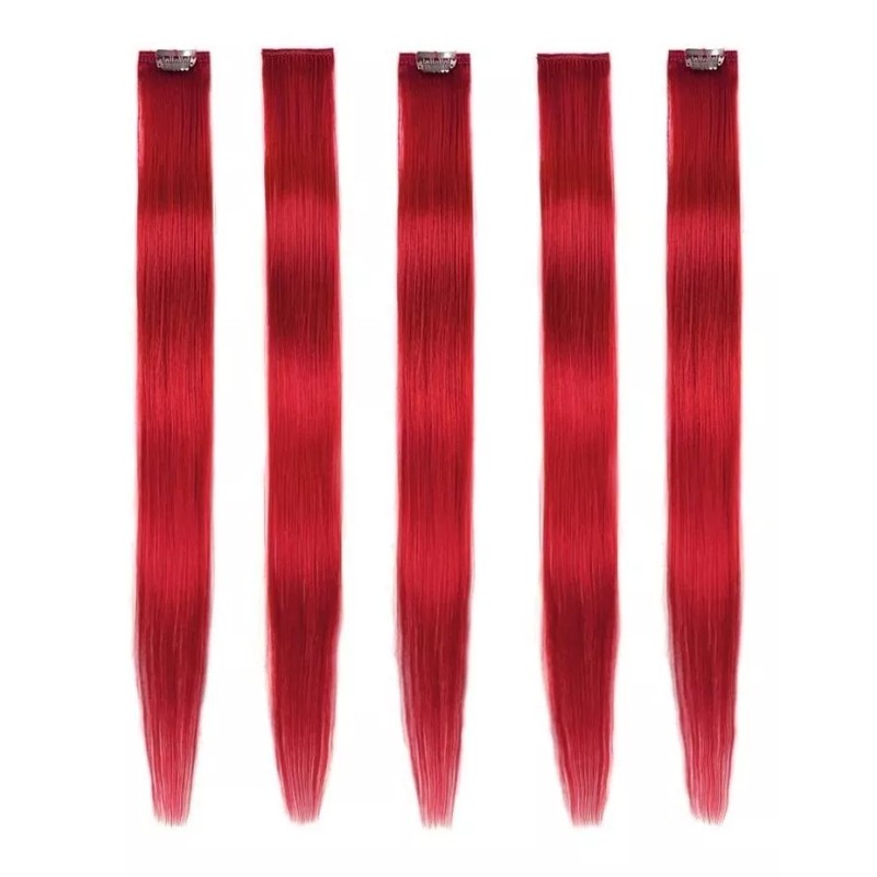 Winsky Extensiones de cabello rojo con clip en cabello humano - Extensiones de cabello 100% rectas para fiestas con clip en extensiones de cabello de color 5 piezas / juego (18 pulgadas, rojo)