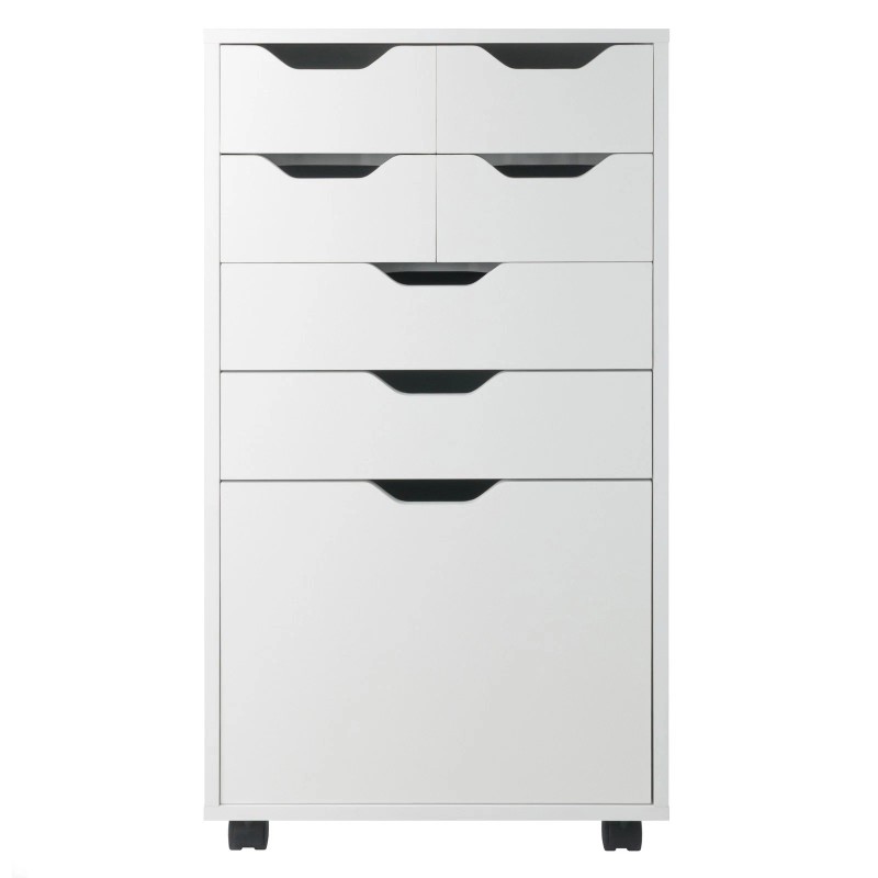 Winsome Wood adds to its Halifax collection with this tall, multi-storage mobile cabinet that is a distinctly versatile piece for a variety of organizational needs. A clean, simple design that will help eliminate the appearance of clutter with convenient cut-out handles that allow for easy-open access. The vertical design allows for minimal floor space to be taken up, while still proving plenty of storage. Ideal for a bedroom, craft room, dorm or even kitchen. It is the perfect organizer for your knitting, sewing, or craft supplies. Or expand your storage for jewelry and styling accessories. Rejuvenate your home-office or den as this unit is well-suited for documents and plenty of space for keeping charging cables and office accessories neat and organized. With 2 fixed, easy-glide, center drawers at 16.06”W x 11.73”D x 2.56”H, and a lower cabinet compartment at 17.95”W x 14.76”D x 13.70”H, making it functional for just about any room of your home. It boasts 4 removable storage bins at 7.95”W x 14.29”, at over 3”H, that function as drawers when inserted. Easily remove one or all to create an open shelf space, or to organize the contents in a different room. Sitting on four wheels, two of which lock, so you can move with ease or keep securely in place. An easy to clean, sturdy composite wood construction finished in a crisp, white that makes this simple, contemporary design certain to brighten any space. Combine this unit with other cabinets from the Winsome's Halifax collection to create infinite storage options (each sold separately).