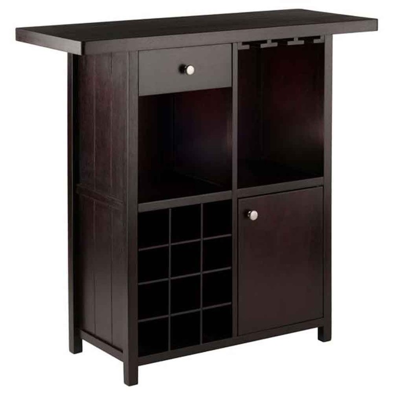 Clean lines, a sleek Espresso finish, and charming wainscoting side panels come together in the Macon Wine Bar. A natural for entertaining or just a relaxing evening at home, this versatile piece provides a wooden wine grid for up to a dozen wine bottles with room in the open shelves and cabinet for more. The wide bar tabletop is an ideal workspace for preparing drinks and serving appetizers. The uppermost open shelf has a built-in stemware holder to securely display your favorite glasses. An easy-glide drawer and lower cabinet provide plenty of room to keep bar accessories, plates, silverware and extra glassware at your fingertips. The drawer and cabinet door are finished with brushed nickel knobs. Made of Solid and Composite Wood in Espresso finish. Top dimensions: 40"W x 15.5"D Upper Left Open Shelf: 12.25"W x 12.75"D x 11.7"H Inside drawer dimensions: 10.9"W x 11.3"D Wine Slot dimensions/each: 3.9"W x 13.25"D x 3.9"H Upper Right Section: 4 Rows of Glass Hangers (can fit glass base of up to 4.13" diameter) - stem opening is 1.4" Open shelf: 12.25"W x 12.75"D x 15.75"H Lower Right Cabinet: 12.25"W x 13.25"D x 16.4"H (inside dimensions) Assembly required Ships in 1 box