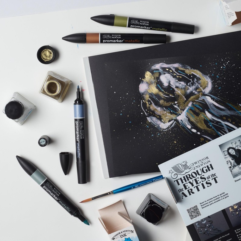 - Set contents: 4 Promarker metallic 4 Drawing inks 1 Brush 1 Mixed media paper pad