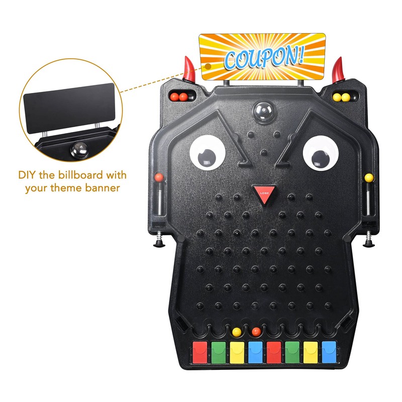 - [Eye-catching Game Board]: 32" x 25" WinSpin Pinball Machine with large game board features red lighted horns with USB charging for visibility & cheerful display and cute wiggle googly eyes on the game board for more appeal, helping to draw crowds in tradeshows, carnivals, events or building relationships at home parties, etc