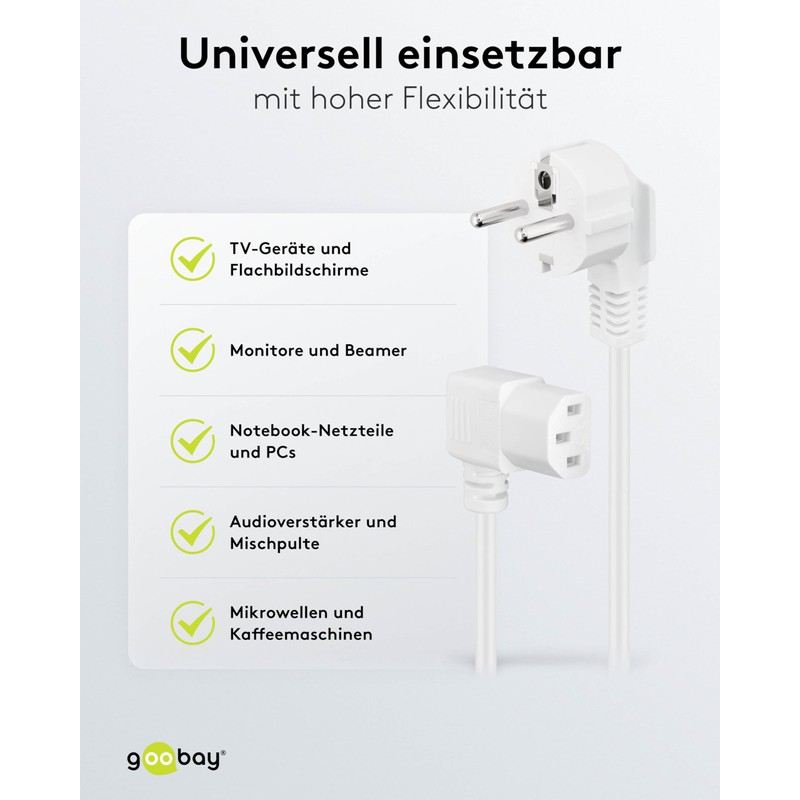 - Universal power cable with 250 V (AC) operating voltage; 0.75 mm² inner conductor cross section; cable type short sign H05-VV-F3G; monitor cable