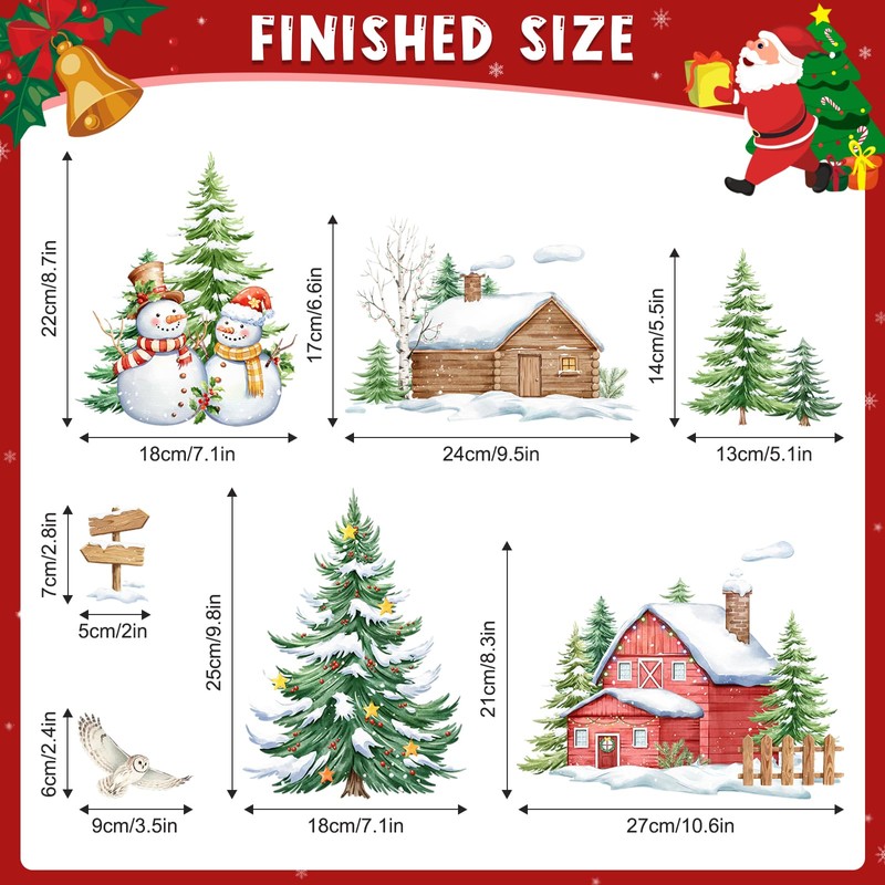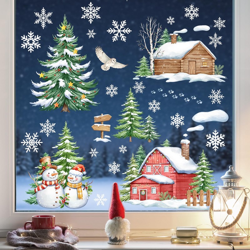 - Christmas window stickers are a delightful addition to any home during the holiday season. These delightful stickers are designed with winter pines trees, cottage house, snowman and snowflakes, adding a touch of festivity to your windows. It is a simple, affordable, and effective way to celebrate the holiday season.
