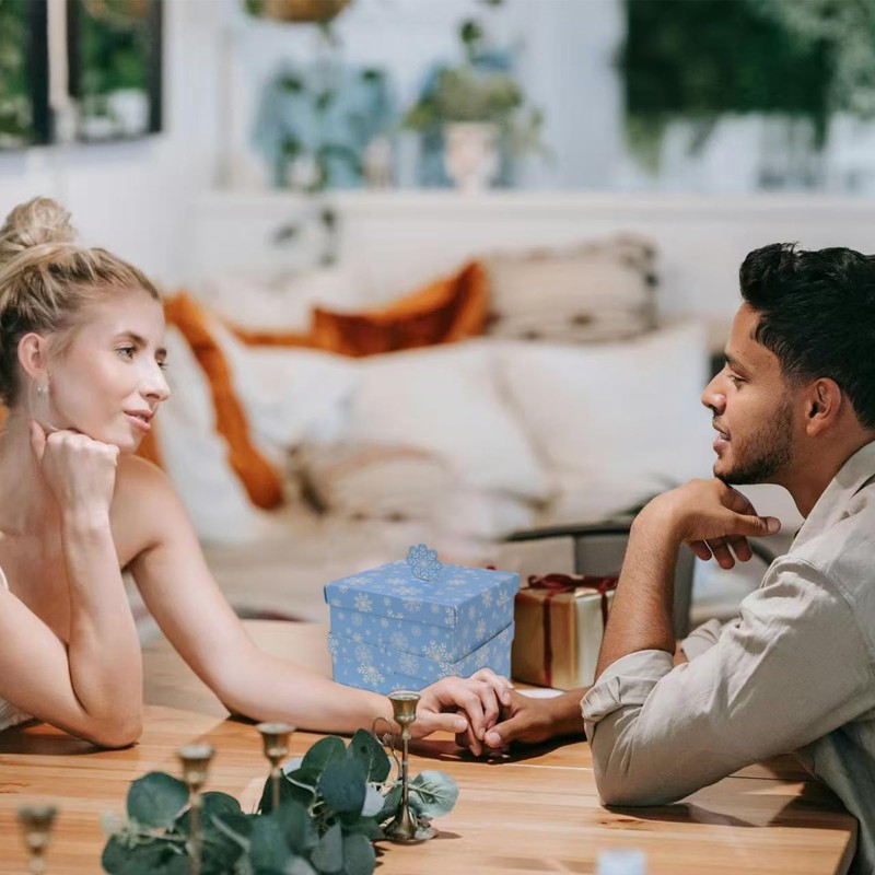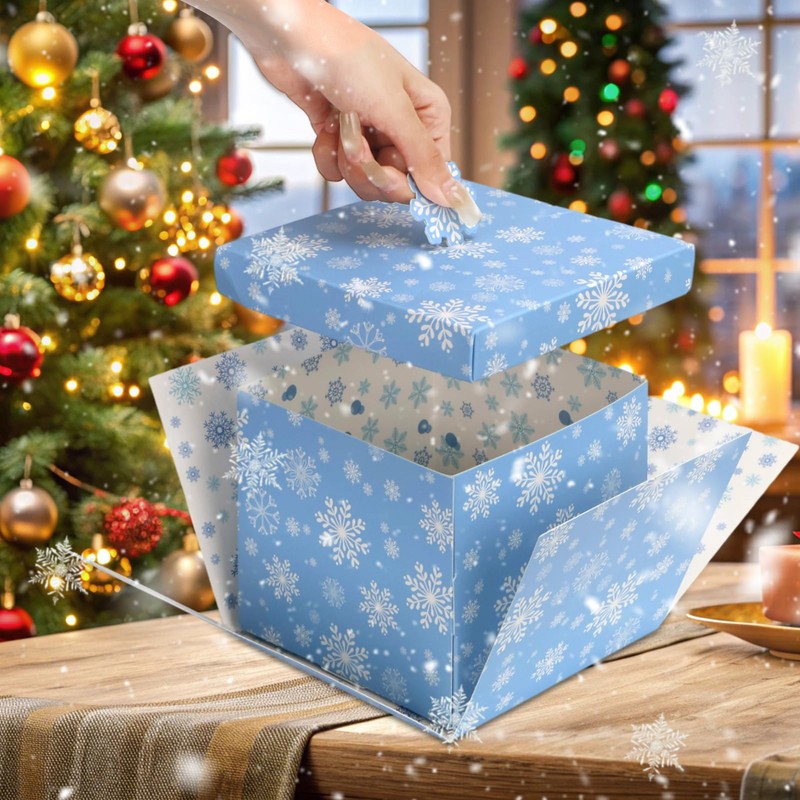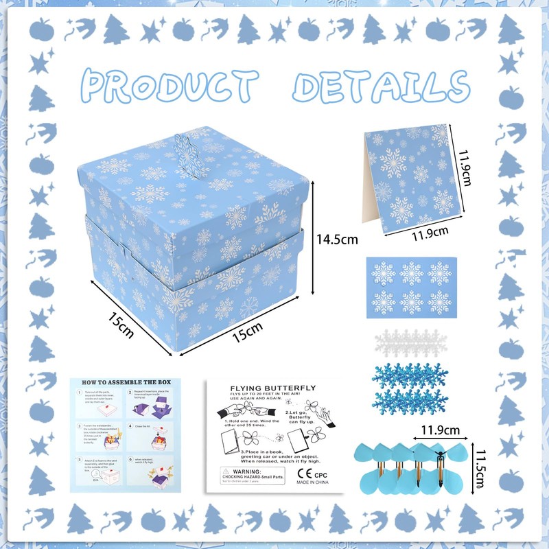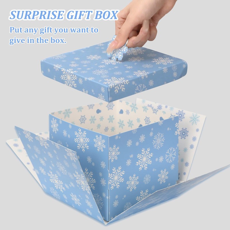 - Easy to DIY : Featuring a blue and snowflake design, the butterfly surprise gift box keeps its surprise element intact; you can tape the memory-filled photos on the surprise gift box and writing words. The center of the gift box provides you with a large space where you can place a sweet little cake, beautiful flowers, cute little dolls, Christmas gifts and other gifts, offering ample room for your tokens of love.