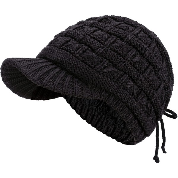 Winter Warm Fashion Knit Adjustable Warm Chenille Lined Winter Knit Visor Beanie Cap with Brim(Black)