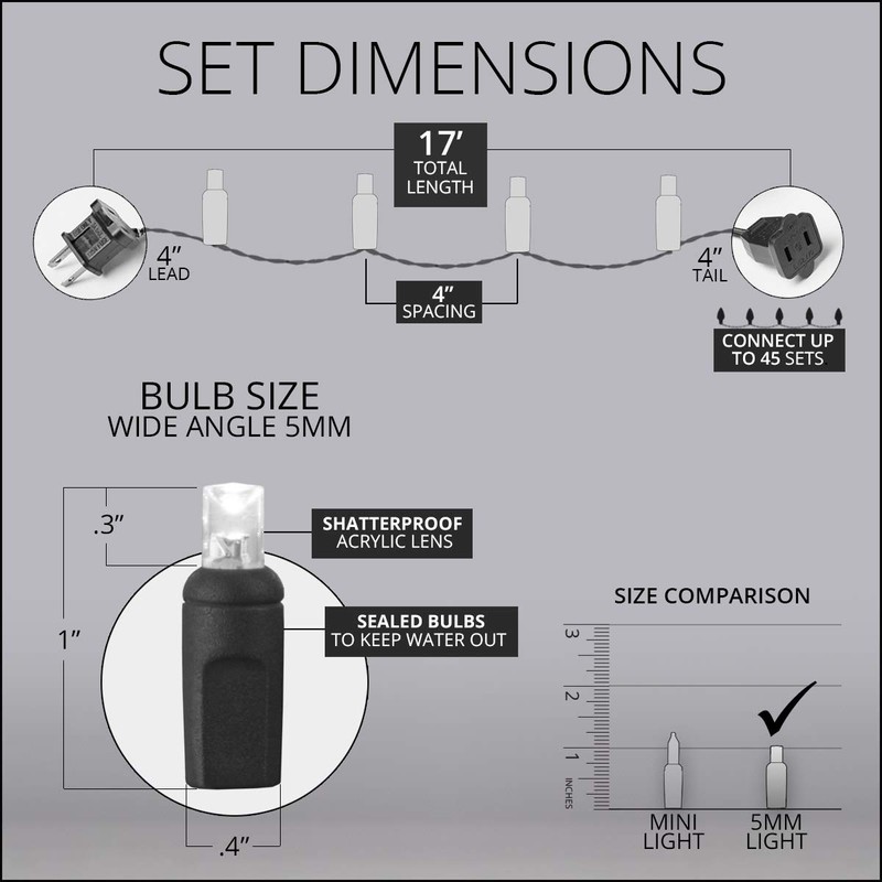 - 50 5mm LED wide angle SoftTwinkle lights spaced 4” apart on green wire, 17’ total length