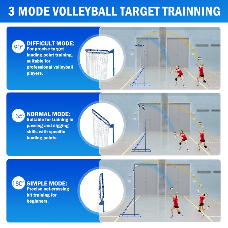 - Three Difficulty Level Adjustments: This trainer features three angle adjustment modes of 90°, 135°, and 180°. The 90° setting is suitable for high-difficulty training for professional athletes, 135° is ideal for general training modes, and 180° is perfect for beginners. You can set the trainer according to your training level to practice passing, digging, and serving. Additionally, it is equipped with a return net that effortlessly collects the practice balls back to the training platform.