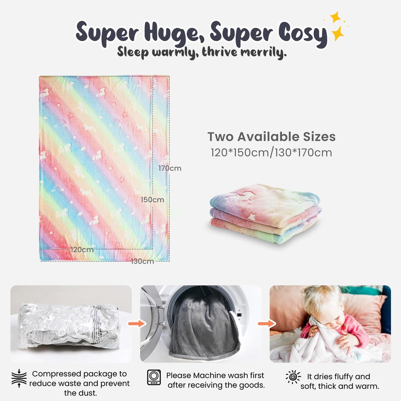 - GLOW IN THE DARK - The unique design of the blankets makes them glow in the dark, which is mysterious and interesting for children while creating a beautiful atmosphere in the children's room. (Please charge in bright sunlight or light for 15-30min first, and the glow effect can be better achieved at night.)