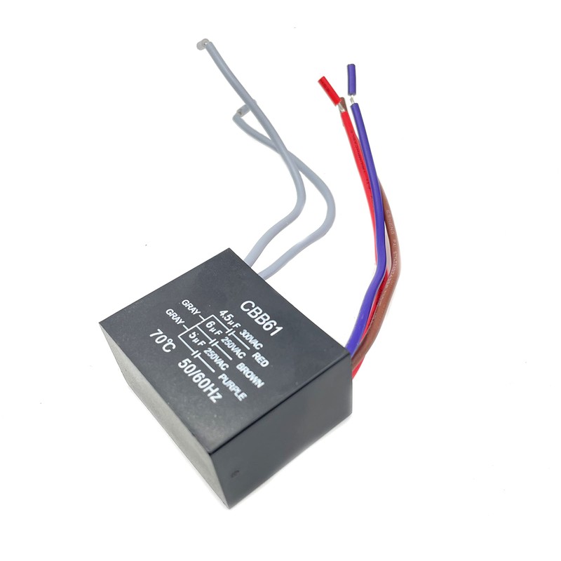 - This is a new ceiling fan capacitor cbb61 4.5uf + 6uf + 5uf 5 wire 250V, tolerance 5%, 250V AC and 50/60Hz rating.