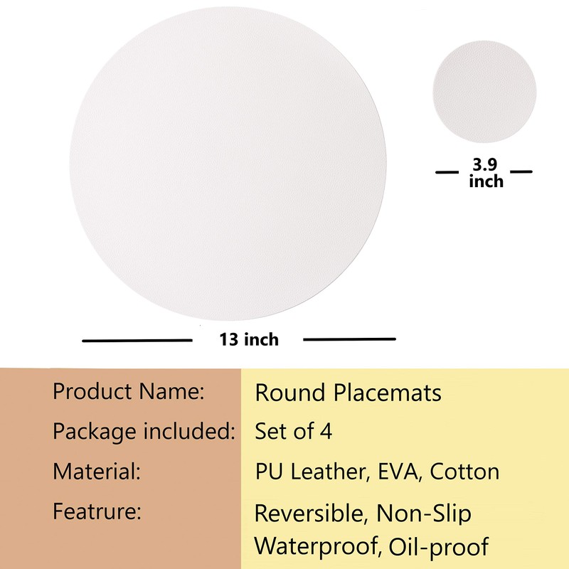 - Package: 4 Place mats and 4 Coaters, Good Size:round diameter 13 inch(placemats),3.9 inch(coasters), ECO Material:PU leather, EVA, Cotton
