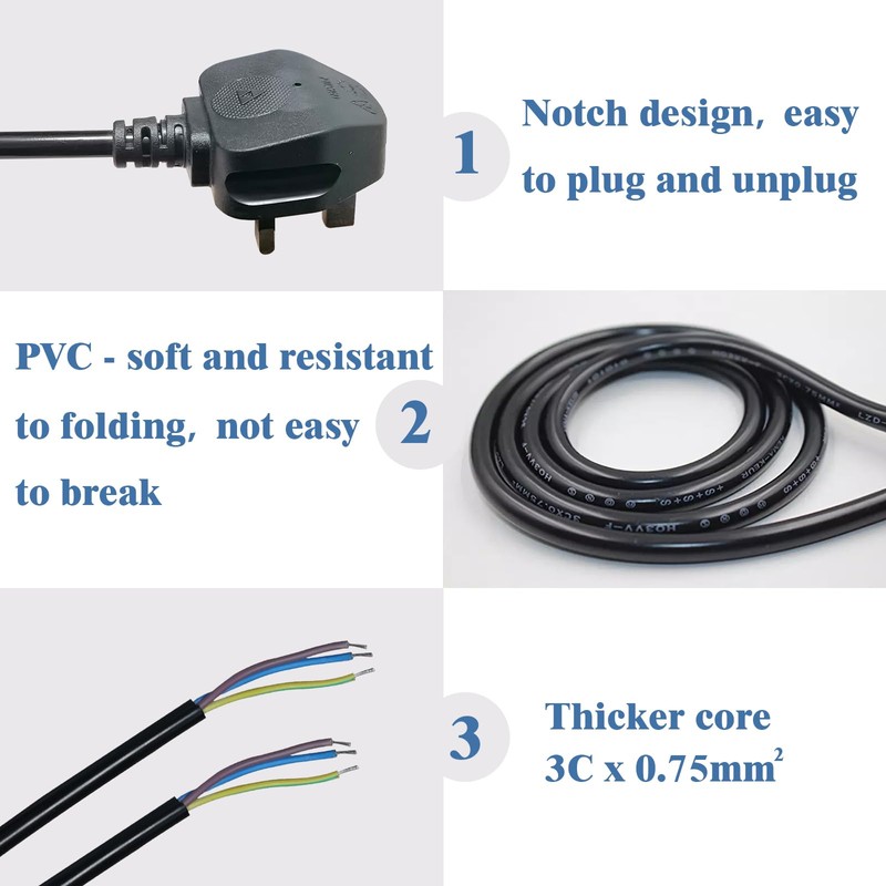 Specifically designed for UK consumers, whether you are a household user, a landlord, or a small - business owner, you can use it with confidence in daily and work scenarios.This power cable is the perfect choice for replacing aged or damaged wires. It is suitable for a wide range of electrical appliances, providing reliable power connections for your life and work.From the kitchen to the living room, from the garage to the office, this power cable can fit perfectly and is a great partner for your electrical devices.