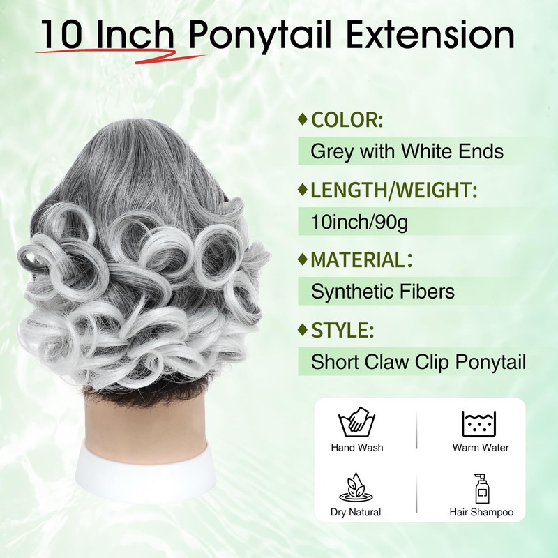 Wirctp Ponytail Extension,10" Claw Clip in Ponytail Extensions Short Curly Ponytail Hairpiece for Women Fluffy Natural Synthetic Pony Tails for Daily Use(Grey with White Ends)