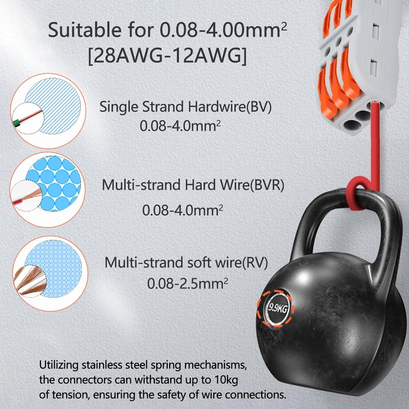 - 【1 Size Fits All Wire within 28 to 12awg】Join different types and thicknesses of wire.Quick connect to wire from 28 to 12awg,no more frustration that you only have the wrong size wire nuts available.It is widely used in building wiring where space is at a premium for all connections requiring.Replace a switch in less than a minute and not have to deal with hassle of unwinding a twisted wire bundle.
