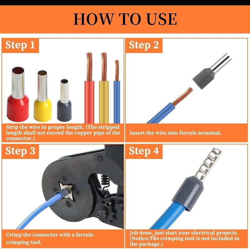 - Easy to use: thanks to the user-friendly design, the ferrules can be easily installed with a crimping tool. Simply insert the wire into the corresponding wire end ferrule and press it securely together to ensure a stable connection. The multi-coloured protective case makes it easier to identify circuits and easily organise cables