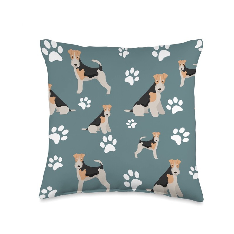 Wire Haired Fox Terrier Dogs Pattern Design with Paw Prints Throw Pillow
