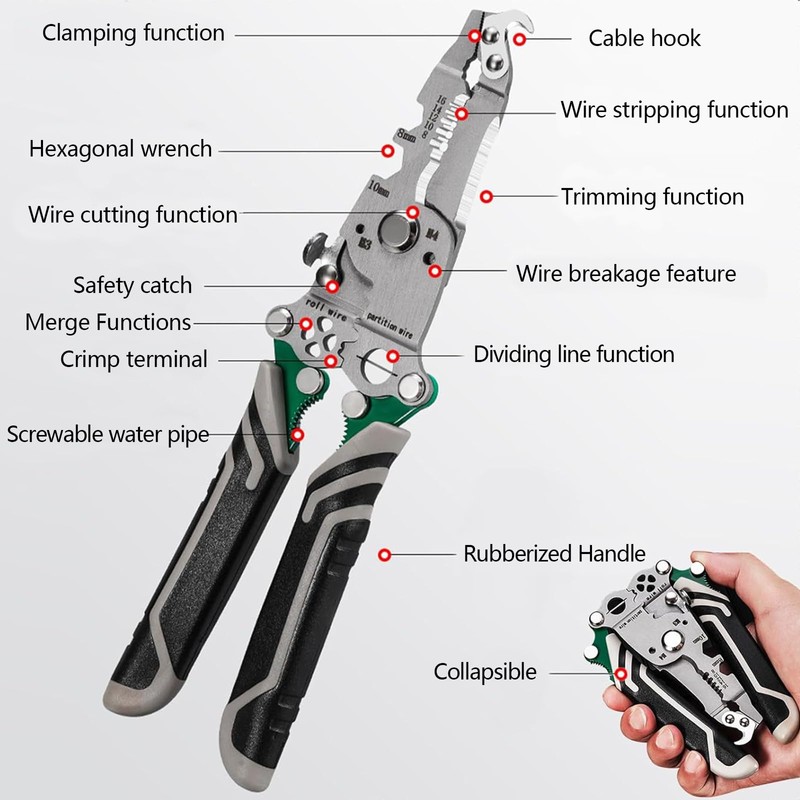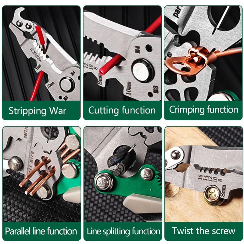 - 16 in 1 Multifunctional: suitable for stripping wires of 8, 10, 12, 14.16 mm. Wire stripper can be easily done multiple tasks, cutting, stripping, crimping, wrapping, splitting, clamping and wrenches with just one cable stripping