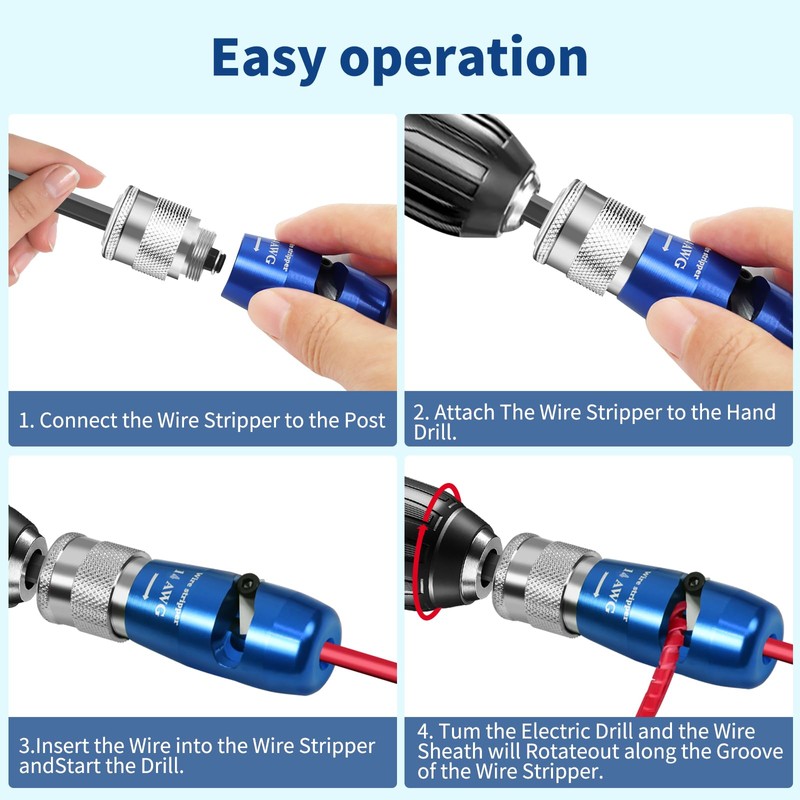 - ELECTRICIAN SPECIFIC QUICK COUPLER:The new wire stripper can be applied to common household cables and electronic cables in the United States, Canada, Mexico, and the Philippines. And single strand and multi-strand can be stripped, Fits most wire caps winged or wingless caps.start hand drill, rotate it several times, pull out wire and complete the parallel wire.