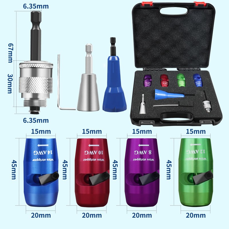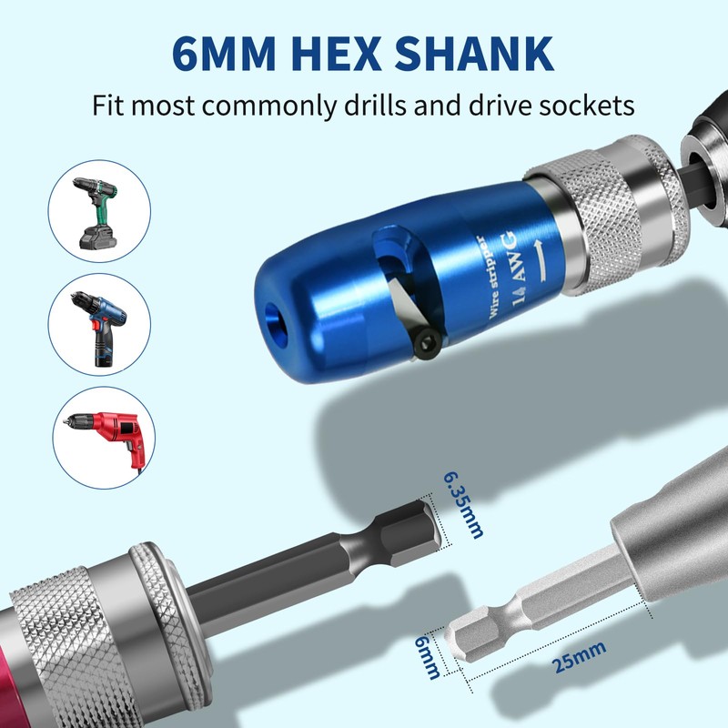 - US STANDARD: Suitable for most drills,Both the wire stripper and wire twisting tool use 6MM hexagonal shanks, Suitable for standard 6mm hexagonal batch handle electric drills, electric screwdrivers, electric wrenches and other electrical tools. Compared to other drill bit wire stripper, this drill wire stripping tool meets US standards and can perfectly strip 8/10/12/14 gauge wire.