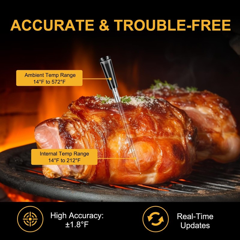 - Precisely Synchronized Data: The cooking thermometer is accurate to ±1.8°F and tracks in real-time to ensure every piece of meat reaches the perfect roasting temperature.212°F Max resistant temperature of the probe and Max 572°F of the probe handle. Rinse the probe with water after use, do not soak it