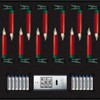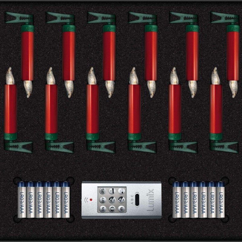 - 12 red LED candles, 12 alkaline quality batteries (type LR03/AAA), continuous light and double flicker mode.