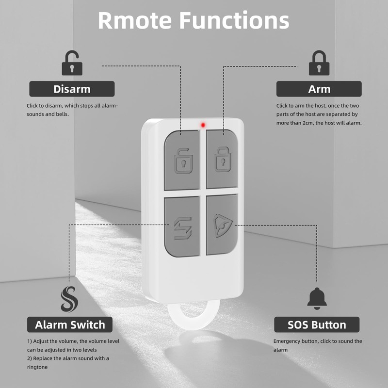 - Two Controls Ways - Two pairs of wireless door open alarm and two remote controls can be synchronized with each other, allowing both doors and windows to be monitored. The unit can also be operated via the side buttons of the door alarm sensor
