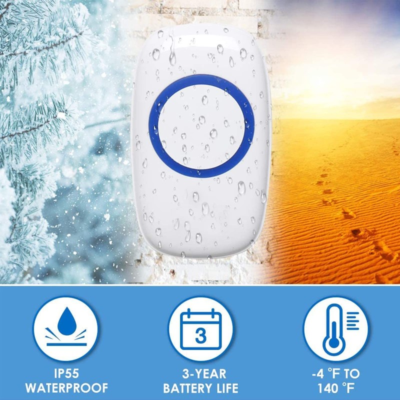 - ⭐【IP55 Waterproof & Memory Function】The button transmitter of waterproof design can be widely use indoor and outdoor, for your gate, shop, office. work with 1*AA battery(included) and can stand under the harshest weather by -20 °C to 60 °C (-4 °F to 140 °F). The memory function ensures that the cordless doorbell kit recalls the last chosen melody and volume setting, even in the event of a power outage.