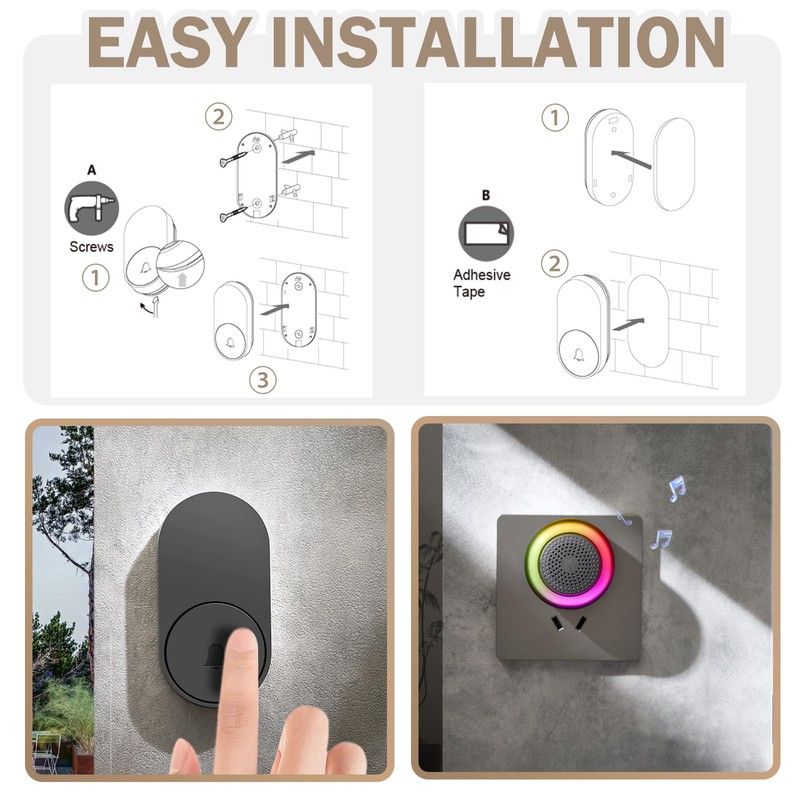 - 【Easy to Install】 Just plug the doorbell wireless receiver into a power outlet, then use the accessories provided to fasten the transmitter to the wall or anywhere you want. The covenient and easy to use design can give you a perfect user experience.