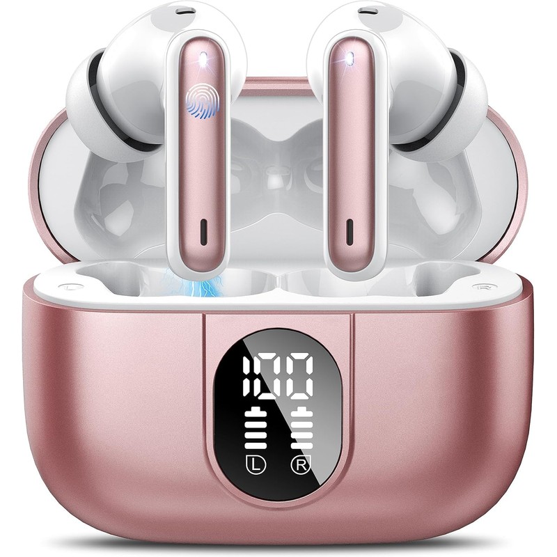 Wireless Earbuds, 2025 Bluetooth 5.3 Headphones Stereo Bass Ear Buds, Bluetooth Earbuds with 4 ENC Noise Cancelling Mic, 40Hrs in Ear Headphones with Dual LED Display, IP7 Waterproof Earphones Pink