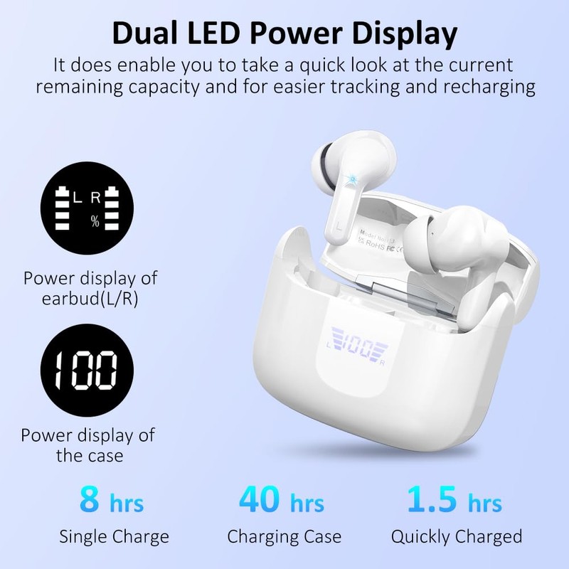 - Dual LED Power Display and Upgraded 40H Playback: Dual LED power display on the case can help check the charging status of wireless earphones and charging case. Ear buds wireless bluetooth can get 8 hours play back from a single charge. Lightweight charging case supports 4 times of recharging for bluetooth earphones, gives up to 40 hours continuous music time. The Type-C charging port can provide faster and safer charging. Take it to travel with you, you can enjoy long-lasting music every day.