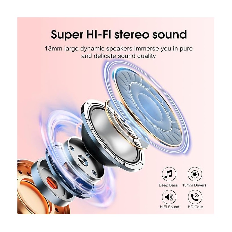 - Rich Bass and Clear Voice Calls: The wireless headphones feature a unique stereo design with 13mm big composite diaphragms for powerful sound and 40% more bass, delivering rich, high-fidelity music. Equipped with ENC noise reduction technology and 4 microphones, they effectively cancel 80% of background noise, ensuring clearer calls during video calls or online meetings.