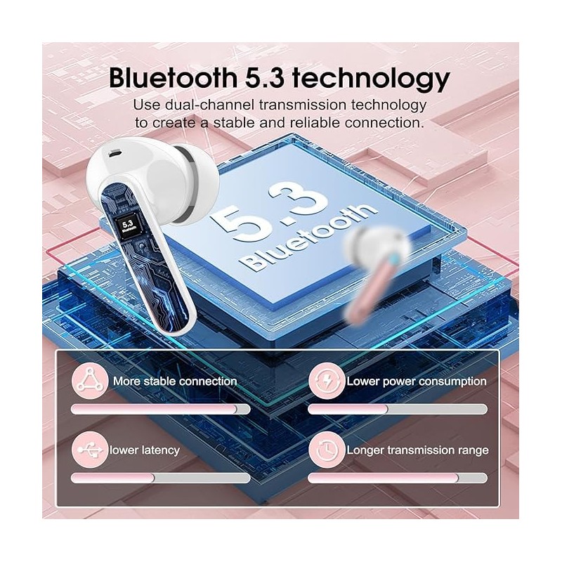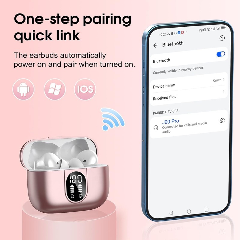 - Enhanced Bluetooth 5.3 and Easy Pairing: J90 Pro wireless earbuds feature the latest Bluetooth 5.3 chipset, offering an 80% increase in connection speed and more stable signal with low latency of 50ms. Perfect for gaming, calls, and sports, they provide up to 33ft of range and automatically connect to the last paired device when the charging case lid is opened.