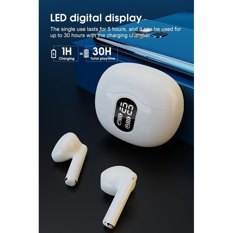 - ✨【30H Playback & LED Power Display】These bluetooth earbuds provide up to 5 hours of high-quality sound output on a single 1H charge, and the included charging case provides an additional 4-6 charges, giving a total playtime of 30H. They feature a smart LED digital display, allowing you to easily monitor the battery consumption of both the earbuds wireless bluetooth and the charging case so you can know when to charge them, You'll never have to worry about battery life even on long trips.