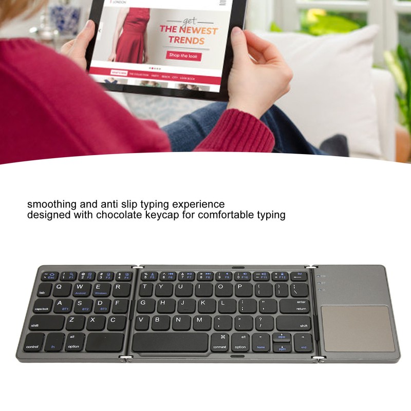 1、Folding Design: This wireless keyboard features folding design which allows you to turn your phone or tablet into a basic laptop, making it easier for you to work anywhere. 2、BT3.0 Connection: This wireless folding keyboard adopts BT3.0 technology, and it can be easily connected with your devices, offering more convenience. 3、Designed with Touchpad: This folding keyboard is designed with sensitive touchpad, allowing users to perform mouse operations and gesture controls, greatly enhancing efficiency. 4、Auto Sleep: Simply fold the keyboard to power it off. This folding keyboard will turn to sleeping mode after 10 minutes no operation, then you can press any key to wake up. 5、Slim Design: This foldable keyboard also features ultra slim and small size, which can be folded into your pocket or backpack to carry around, which is perfect for travel, work and daily life.