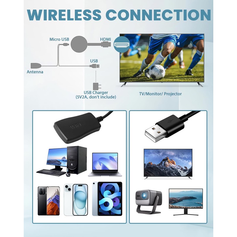 - Easy to use & plug and play: no additional software or drivers required! Simply connect the Wireless HDMI dongle to your Wi-Fi router and enjoy HD viewing instantly. The quick connection makes it easy to share your content without tangled cables.