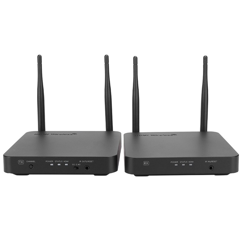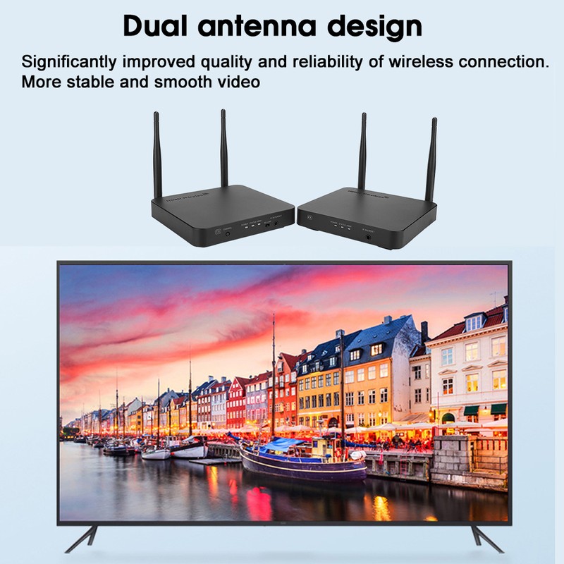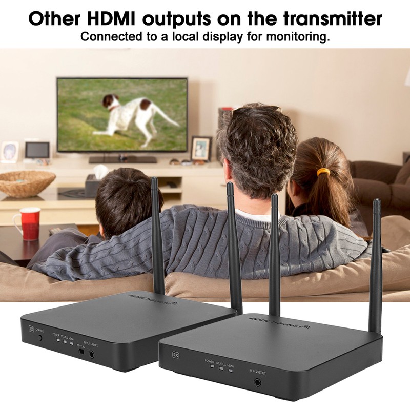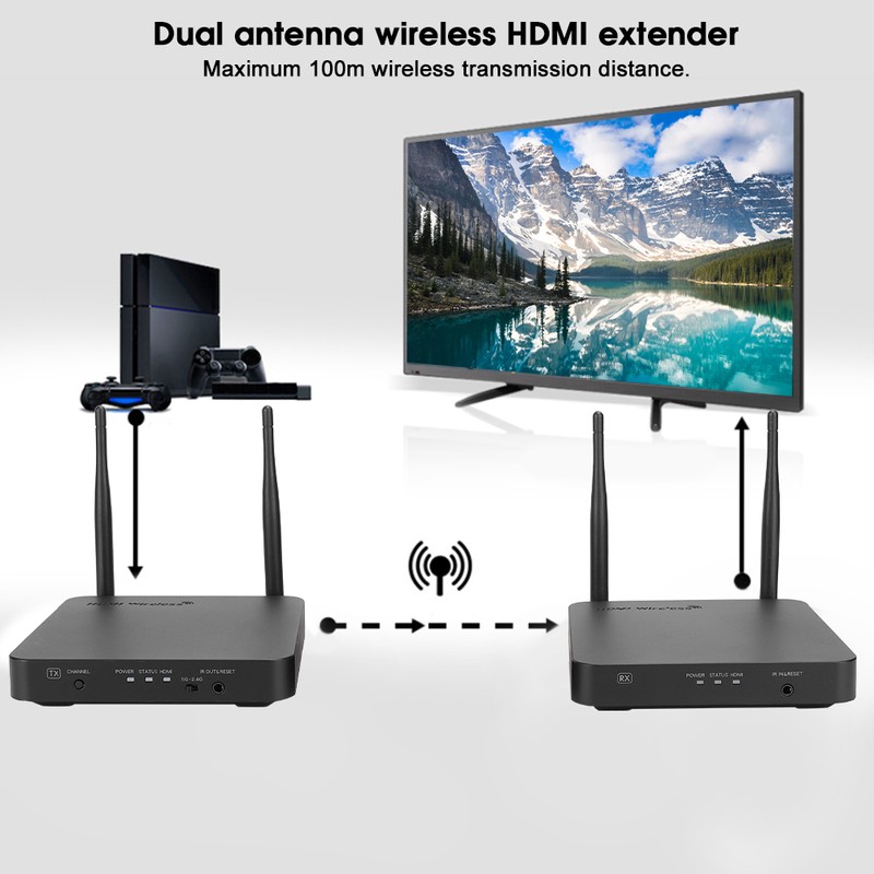1、Direct sight and no other interference are required in the same WIFI frequency band to achieve the desired effect. 2、Our dual-antenna wireless HDMI extender helps you transmit high-definition HDMI audio / video signals from your HDMI source to an HDTV, monitor or projector at a maximum distance of 328 feet (100 meters). 3、Dual antenna design-significantly improves the quality and reliability of the wireless link, making the video more stable and smo 4、Other HDMI outputs on the transmitter can be connected to a local display for monitoring. 5、Supports infrared expansion,HDMI extender allows source equipment to recognize remote commands.