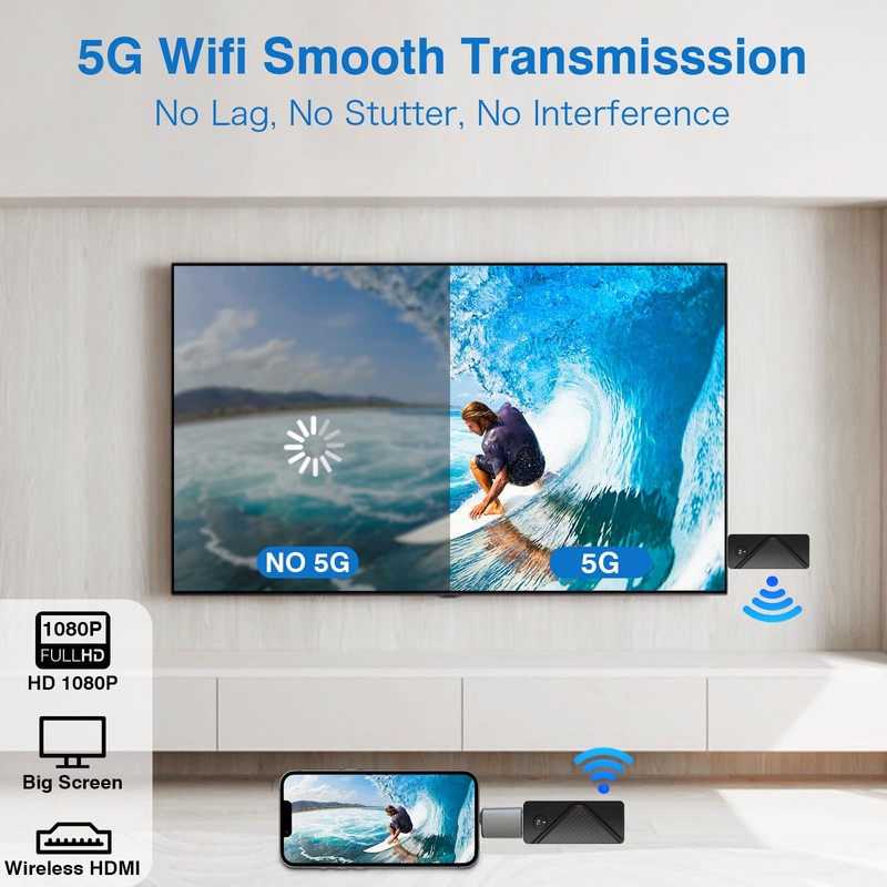 - 【165 FT/50M Long Range Transmission】: Wireless HDMI transmission distances up to 165 ft/50(Pro) meters. Built-in advanced dual-band chip (2.4G and 5G), strong anti-interference, stable signal transmission. It maintains a reliable connection even through walls and obstacles.