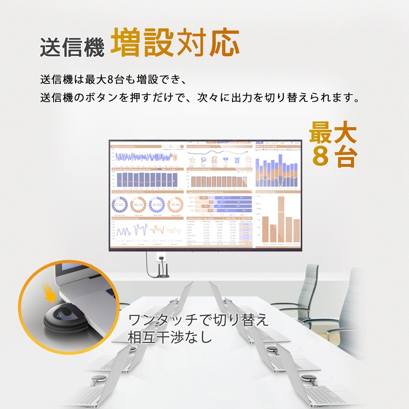 Specifications: Resolution: Transmitter: 1080p, Receiver: 1080p, 720p, 4K (30hz) Frequency Range: 5Ghz Transmission Distance: Up to 164.4 ft (50 m) (without obstacles) 15 - 20 m (walls and partitions), Transmitter Extension Support: Up to 8 devices (transmitter can be added to 8 transmitter per receiver). Type C: Smartphone , Tablet, Mac HDMI: Windows PC, Laptop, Recorder, TV Box, Supported Receivers: Monitor, TV (TV), Projector, Mobile Display Supported Operating Systems: Linux, Windows, Mac iOS, Android, Mac OS, Chrome Set Includes: HDMI Transmitter + Detachable Type Adapter (2 in 1), HDMI Receiver, 2 Antennas, HDMI Cable, USB Power Cable, User Manual Port, For Connecting Transmitter: HDMI, Type-C (also known as usb-c Type c) Receiver Connection: HDMI, VGA, 3.5mm Audio Port for Power Supply: Type-C