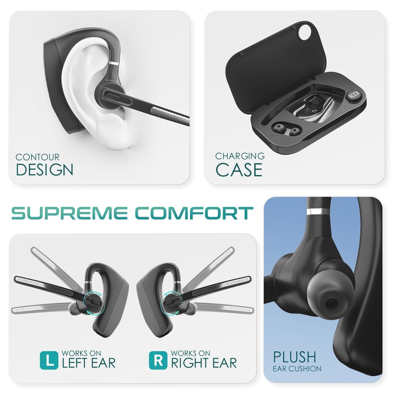 - [Comfortable & User-Friendly Design]: Enjoy maximum comfort during extended use with the ergonomic design of this wireless headset. The lightweight, soft, around-the-ear body and multiple sizes of included ear gels ensure a snug, custom fit for any ear size, providing all-day comfort without fatigue. Intuitive buttons for call control, including mute, volume, and answer/end functions, make operation effortless