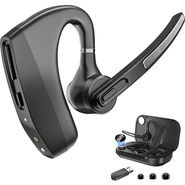 Wireless Headset Earpiece with USB Dongle & Noise Cancelling Mic for PC, Phone, Bluetooth Headphones Over-Ear with Microphone for Zoom Meetings, Work from Home, Trucker Use